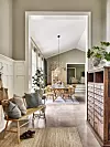 Det kombinerte allrommet utstråler harmoni, hvor det landlige kjøkkenet i svart gir tyngde til det lyse rommet. Gulvet i pusset betong gir fin lunhet, sammen med tepper og gardiner i beige toner.