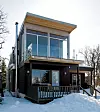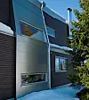 Påbygget er moderne, med vingeformet tak. Det er brukt aluminiumsplater i fasaden, men ikke i tilknytning til oppholdssteder, på grunn av risikoen for reflekser. Huset har liggende og stående brunbeiset bordkledning og store glassflater. De store takutspringene er et estetisk element, men beskytter også vinduene og reduserer varmetapet.