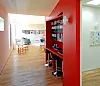 Huset er preget av en rekke sikre arkitektoniske løsninger, deriblant den rødmalte kjernen i midten av første etasje, med bad og hjemmekontor. Rundt denne kjernen går det en åpen gang, og fra denne er det inngang til badet.