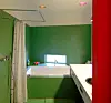 Baderommet med grønne fliser oppleves som en egen, frodig velværeverden. Via et lite, lavt plassert vindu er det diskret gløtt fra badekaret og mot vrimlearealet ved stuen og hagen. Runde, fargede lamper i himlingen, nesten som koøyer i regnbuen, setter kulør på lyset som kommer inn i rommet fra loftsstuen. Lampene er arkitekttegnet til huset.