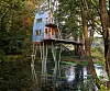 Som et utkikksplatå springer huset ut av en klippe som er dekket av mose og kledd med gran- og lønnetrær.