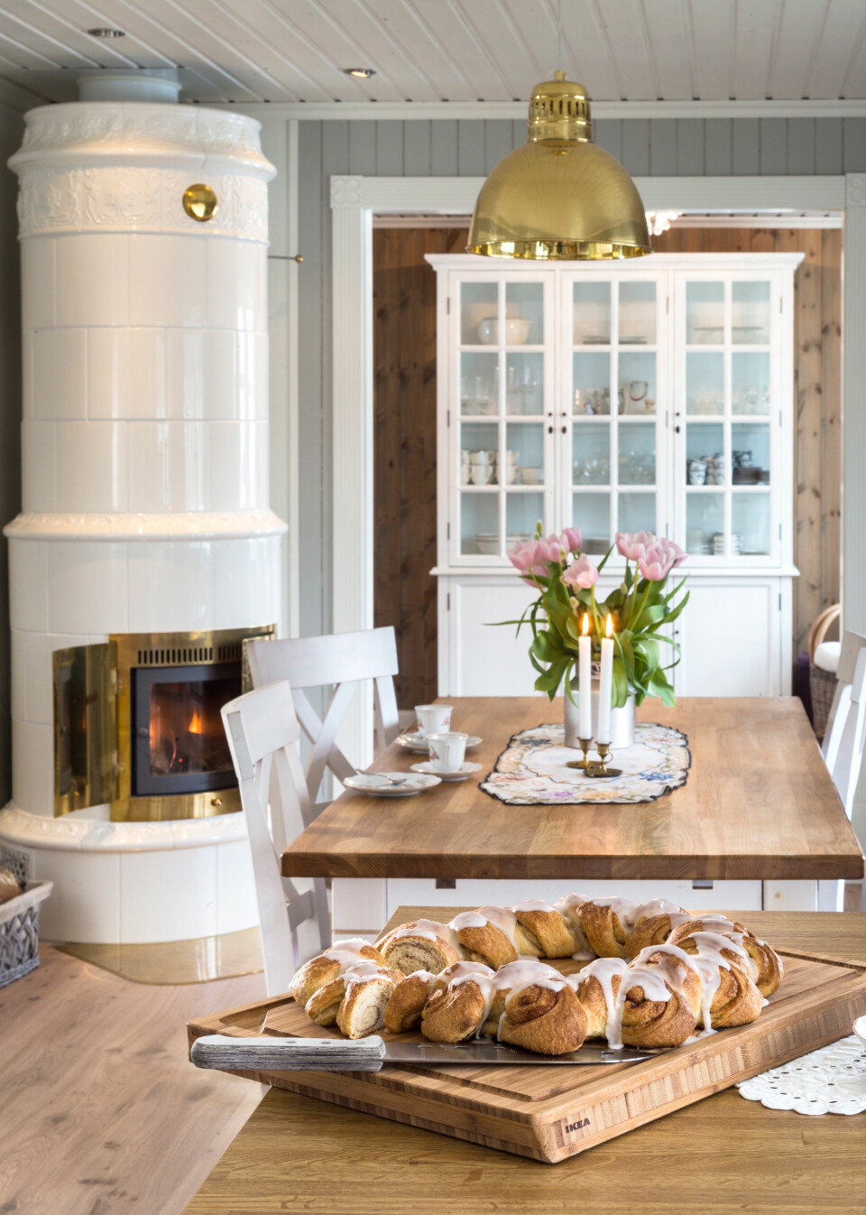 Paret valgte å la kjøkkenet være husets hovedrom og hjerte, og i hjørnet av det romslige kjøkkenet står selve smykket i huset, kakkelovnen. Den var det første som ble budsjettert inn.