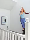 Trappeavsatsen i annen etasje skiller seg imidlertid ut, veggen er malt blå som havet. Og like bortenfor, ved det hvite gelenderet står en kvinne i blått og gull. Boltet fast i veggen, en smule dristig med stor utringning.