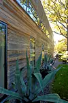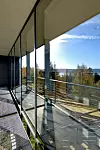 Stål, glass og sedertre pryder bygningen som ligger parallelt med konturene i terrenget.
