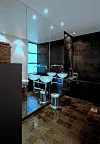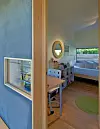 Hovedsoverommet ligger i første etasje og har et bad som nærmeste nabo. Med kun en glassvegg imellom utgjør disse to rommene en helhet, en sammenhengende romopplevelse. Med to store dører til den bakre, tette hagesiden av huset får soverommet kontakt med resten av anlegget.