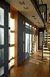 Alt fast inventar i huset samt gulv er utført i solid, lys ask. Første etasje har takhøyde 2,60 m, noe som er vesentlig høyere enn norsk standard.