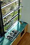 Alt glasset gir raskt full oversikt over rommet og åpner for et 80-graders panorama over sjø- og skogslandskapet.