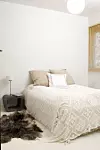 To vinduer på soverommet sørger for rikelig med lys. Saueskinnet på gulvet har Bente knabbet av broren. Han hadde det i bilen sin tidligere. Nattbordet i betong lagde Bente på arkitekthøyskolen.Foto: Trude Lindland