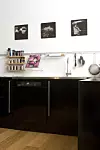 Bente ønsket ikke å loppe seg ved å kjøpe helt nytt kjøkken. Hun fjernet overskapene på den profilerte kjøkkeninnredningen i furu, og lot stammen fra benkene stå. Deretter kjøpte hun de billigste frontene fra Ikea og spraylakkerte dem svarte. For dette betalte hun rundt 25 000-30 000 kroner.Foto: Trude Lindland