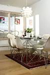 Stolene Plastic Chair har Bente ønsket seg i årevis. Da hun solgte leiligheten hun hadde i Oslo med gevinst, slo hun til og kjøpte dem. Spisestuebordet er fra Ikea. Det samme er lampen. I vinduet henger blyglassbilder lagd av venninnen Sigrid.Foto: Trude Lindland