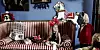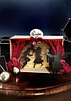 Bruk en skoeske som scene. Trekk stoff til forhenget på en snor og bind fast øverst på hver side av esken. Dekorer med bånd. Du kan male bakgrunnen, eller lime på et fullpapir som vi har gjort. Du velger farge selv, bare husk at den er lys, så de sorte silhuettene synes. Du finner våre silhuetter på istock-photo. Vi har printet dem ut og limt på sort kartong, for deretter å klippe dem ut. Så er de festet med tape på bambusstenger, som er malt sorte med hobbylakk. Lag hull i sidene på skoesken og før silhuettene inn fra siden.