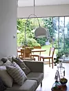 Senket gulvet. For å binde sammen tilbygget med eksisterende førsteetasje, ble gulvet i stue og kjøkken senket. Sofaen er fra BoConcept, spisebordet i eik er fra Heal's, spisestolene er fra Laura Ashley. Salongbordet er fra Marks & Spencer. Styling: Tone Kroken.Ragnar Hartvig