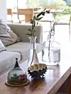 Vekster fra hagen. Aspargeskvister i vinballongen og en Kamelia-gren i karaffelen fra Kosta Boda. I osteklokken, som er en norsk antikvitet, ligger en valmue. Den blå skålen er en gave fra Maris mor, og Maris favoritteiendel. Kunstneren som har laget den heter Johanne Monrad. Hun har studio på Verftet i Bergen. Styling: Tone Kroken.Ragnar Hartvig