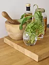 Urtene er salvie og timian fra hagen i glassene på trefjølen, og det er hjemmelaget rosmarinolje i den store glasskrukken bak. Styling: Tone Kroken.Ragnar Hartvig