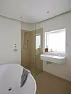 Badet i andre etasje er kledd i Corian. Himlingen med dimbare downlights er senket og har ledlys langs kanten. Ragnar Hartvig