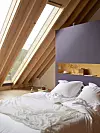 Fargen på sengegavlen heter Twilight Cinders 1/s0rb09087, og er fra leverandøren Dulux. Vinduene er fra Roofglaze.co.uk. I nisjen i sengegavlen er det lagt inn lysbryter og dimmefunksjon til alt lys i rommet. Her styres også de elektriske rullegardinene. Det er ikke synlig på bildet, men det er montert uplights i gulvet nær der skråtaket starter, noe som øker romfølelsen. Bøker fungerer som nattbord. Tekannen er fra Menu, en julegave til paret fra Maris mor. Styling: Tone Kroken.Ragnar Hartvig