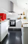 Det store kompromisset ble å fjerne den gamle sjarmerende trappen for å få bedre plass på badet. Nå fungerer den nye trappen som en romdeler inn mot kjøkkenet. At gulvet i gangen og kjøkkenet er i svart linoleum, digger Lene. Det er både stilrent og enkelt å holde rent.Kathrine Sørgård