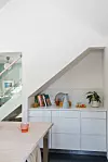 På kjøkkenet er det blitt plass til en ekstra benkeplate med skap under, i nisjen under trappen. Kaffekannen er fra Eva Solo, og treboksen har Knut Waldemar laget på sløyden som barn. Koppen på bordet er fra HK Living.Kathrine Sørgård