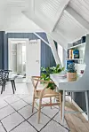 Fargen St. Pauls Blue, fra Jotun, er valgt fordi den mørke nyansen gir bedre dekke for skader på det gamle panelet, samtidig som den gir en fin dybde og lunhet. Skrivebordet har tilhørt Lenes far. Det malte hun for lenge siden, så fargekoden er gått i glemmeboken.Kathrine Sørgård