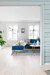 Luftigheten og åpenheten i de to stuene var noe av det paret falt for. Det flotte gulvet er pusset ned og satt inn med hvitpigmentert olje. Den blå sofaen som Knut Waldemar hadde fra før, er Lenes favorittmøbel. Den er fra Bolia. Fargen på de originale tømmerveggene heter Tender Green, mens fargen på den innerste veggen heter Tidløs, begge fra Jotun.Kathrine Sørgård