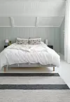 Soverommets luftighet er rendyrket med duse farger. Siden det er et familiemedlem til på vei, skal rommet etter hvert deles i to. Fargen på veggen er Soft Mint, mens gulvet har fargen Bomull, begge fra Jotun.Kathrine Sørgård