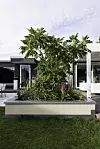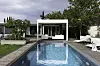 Vi kommer inn i hagen gjennom en passasje som går mellom hovedhus og studio. Uterommet er avgrenset av pergola, hus og studio på den ene siden, mur og halvvill natur på den andre. Egentlig gir det mer mening å snakke om uterom i flertall. Her finner vi spiseplass, lounge, basseng, plen, enda en spiseplass.