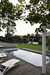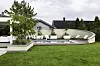 Familiens hage består av to spiseplasser, basseng, lounge og plen.