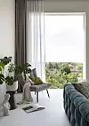 Marsona elsker å fylle hjemmet med dagslys, og i tospann med Korab valgte hun derfor å sette inn et mye større vindu i stuen i andre etasje. Men dette innebar at de måtte bygge et utstikk for å få plass nok til vindusstørrelsen de ville ha. Både vegger og tak er malt i fargen Ascott fra Jotun, mens gulvet er klikkvinyl fra Pergo. Stolen ved vinduet er fra Ellos, mens pidestallet er fra Hugna. Gardinene er sydd på mål. Filippa Tredal