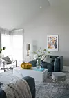 Å komme inn i stuen er som å besøke en lounge på et eksklusivt hotell. Takhøyden gjør at rommet føles luftig, noe som understrekes av de lyse flatene. Sofaen Belwood er fra Ellos, mens lenestolen er fra Ikea. Puffen med metallunderstell er fra Mio, der også sidebordet og sofabordet i marmor og eikefiner er fra. Teppet måler hele 240 x 340 cm og er fra Trendcarpet. Lampen på sidebordet og putene er fra Lille Interiør i Moss, mens bildet over sofaen er fra Desenio. Filippa Tredal