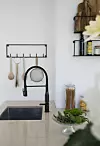 Den svarte kjøkkenkranen, fra Ikea, matches av vegghyllen og knaggrekken i serien Meert fra Fagmøbler. Filippa Tredal