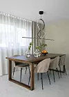 Kjøkken og spisestue er i samme rom med åpen planløsning. Spisebordet i tre er fra Ikea, og stolene med stofftrukket overdel og metallben er fra Mio. Over bordet henger en pendel fra Flos, mens vasene er fra Søstrene Grene. Filippa Tredal