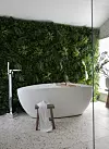 Den grønne veggen med kunstige planter gir badet et visuelt løft. Korab og Marsona elsker veggen som de har laget selv, satt sammen av ferdige kvadrater fra Green Plant Walls. Badekaret og armaturen er kjøpt hos AliExpress, og terrazzoflisene er fra Modena. Filippa Tredal