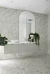 Servantskapet er egentlig kjøkkenskapmoduler fra Ikea, med benkeplate i laminat. Frontene er dekorert med hjørnelister i plast for å matche de rillede veggflisene som skimtes i speilet, og deretter malt i fargen Washed Linen fra Jotun. Servanten er fra Megaflis og armaturen fra VVSKupp. Speilet er laget hos en lokal glassmester, etter Marsonas eget design. Korab har festet LED-stripe rundt for stemningsfull effekt om kvelden. Innredningen og speilet, inkludert LED-stripen, kostet under kr 10 000 til sammen.Filippa Tredal