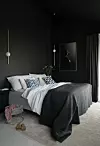 Soverommet bryter mot det ellers lyse interiøret i huset, med vegger og tak i Dempet Sort fra Jotun. Gardinene er bestilt på mål, mens sengetøyet er fra Kid Interiør. Pynteputene er fra Lille Interiør, og vegglampene er kjøpt hos AliExpress. Bildet på veggen er et fotografi av Marsona mens hun ventet parets yngste barn, tatt av Haslien Fotografene.Filippa Tredal
