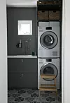 Marsonas tips er å legge vaskerommet til den etasjen der man oppholder seg mest – det gjør det enklere å få klesvasken unnagjort. Hun har gjort vaskerommet til et lunt og hyggelig sted å oppholde seg, med marokkanske gulvfliser fra Fagflis og mørkegrønne vegger tilpasset innredningen fra Ikea. Vaskemaskinen og tørketrommelen kommer fra Miele, mens den praktiske trekrakken er fra Ikea. Filippa Tredal