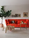 Den knallrøde Mariposa-sofaen fra Vitra var et impulskjøp da Linn-Heidi og Martin flyttet sammen for første gang. Stolen er kjøpt på billigkroken hos Ikea, og bordet er et bruktkupp fra Botanisk Hage Møbelforretning. På veggen henger et Savio-trykk Martin har arvet av sin familie, kunst av Andreas Edvard Disen og bruktkupp med ukjent opprinnelse. Eiketreet er kjøpt på Fretex. Filippa Tredal