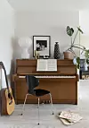 Pianoet er et bruktkupp fra Finn og er, i tillegg til å være et nydelig møbel, heldigvis også i bruk, primært av Martin som opprinnelig er musiker. Lampen Gatto er fra Flos, og Myren-stolen er vintage, kjøpt hos Gamle danske på Sagene i Oslo. Fotografiet er av Charlie Fjätström.Filippa Tredal