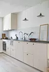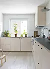 GJORT DET SELV: Skapstammene til Ikea-kjøkkenet som sto her da familien overtok, er beholdt, men flyttet litt på. Martin har selv laget nye kjøkkenfronter av kryssfinerplater i bjørk, behandlet med hardvoksolje. «Det var viktig for oss å velge løsninger som er robuste nok til å tåle tidens tann, både designmessig og slitasjemessig.»Filippa Tredal
