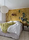 Mens første etasje har fått en palett med lyse, rolige farger, har familien dratt på med litt mer farge i soverommene. Her er veggen er malt med kalkmaling i fargen Rakle fra Gjøco. Taklampen er fra Vitra, sengekappen fra Granit, nattbordet fra Aytm og sengetøyet fra Kid Interiør. «Velg for deg selv i et langt perspektiv, ikke for andre i et salgsperspektiv.» Filippa Tredal