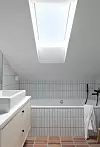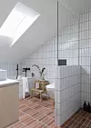 Flisene i sprutsonen er fra Vitra, men taklampene er gamle. De er funnet på gården som Martin stammer fra, og er trolig fra tidlig 1900-tall. Filippa Tredal