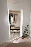 Garderoben i gangen er snekret av rester fra gulvleggingen, i heltre douglasgran fra Dinesen. Garderobestangen er rett og slett et kosteskaft! Filippa Tredal
