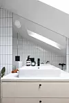 Benkeplaten er restmarmor fra selveste Nasjonalmuseet, som familien var så heldig å få av Ellingaard. Dusjen, badekaret, toalettet og spyleknappen er alle kjøpt på finn.no av folk som har kjøpt feil varer, men som av en eller annen grunn ikke har fått brukt bytteretten. Baderomsmøbelet har Martin snekret. Bare flisene på veggene er nye. Her dukket et annet prinsipp opp for den miljøbevisste arkitekten.