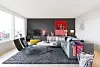 - Den fungerer som en fin kontrast mot de andre hvite flatene i interiøret, og den bidrar til å gjøre rommet kortere og mindre firkantet. Den er også en flott bakgrunn for det røde maleriet.
