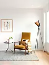 RETROINSPIRERT KROK: Hjørnet ved veggen inn til kjøkkenet fungerer foreløpig som en krok for lesing og avslapping. Planen er med tiden å installere en peis, som vil bidra med varme og god stemning både i kjøkken og stue. Den okergule stolen har noen år på baken, men glir elegant inn i det stilrent møblerte hjørnet av den 40 kvm store stuen. Stålampen Oslo Wood fra Northern Lighting, Est Design, har nostalgiske trekk fra samme periode som stolen. Bord Don't leave me og gulvteppe Peas i fargen Soft Grey, str. 140 x 200, fra Hay, kr 3599, OE Strande. Bilde er signert Tom Gundersen. Der bildet henger nå, planlegges det en peisinnsats. Unødvendig å si at det vil tilføre kroken en tilleggsverdi.FOTO: Espen Grønli