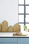 Praktisk dekor. De huslignende eikefjølene fra Ferm Living kombinerer funksjon med dekor. Kjøp flere, sett dem tett i tett, slik får du en illusjon av skyline på kjøkkenbenken. Cutting Board finnes i fire ulike størrelser, fra kr 210 til 450, ferm-living.com.Produsenten