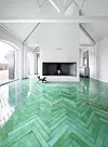 UNIKT: Gulvflisene som ligner parkett i fiskebeinsmønster er håndlagde i grønn lavastein. De heter Cristalli/65x400 og koster cirka kr 4400 pr kvadratmeter, produsent Made a Mano, madeamano.com.Foto: Produsent
