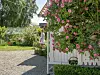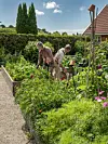 I hagen vokser en kombinasjon av prydblomster og spiselige vekster. Store roser går igjen som en rød tråd.