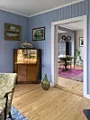 I annen etasje har Solveig malt trepanelet på veggene og beholdt tapetet på noen av veggflatene. De fleste gulvene er slipt og malt lysegrå. Det er også bygget et lite toalettrom ved å ta areal fra det største soverommet.