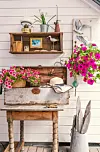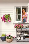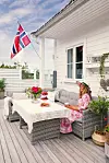 FØLELSEN AV SOMMER: Laila er lærer, og er glad i å ordne til i hus og hage. Hun er glad i å omgi seg med sommerblomster i bed og krukker. Den håndheklede duken er et bruktkupp. Her inntas frokosten i morgensola.Kathrine Sørgård