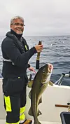 MATAUK: Noe av det fine ved å hytte i Sveggen, er at det er kort vei til matfatet. Her har Kim fanget dagens middag. Her ute kan man oppleve fantastiske dager både på land og til sjøs. På Griptaren dras stortorsk og sei, som fyller opp fryseren, også til Kims foreldre. Privat